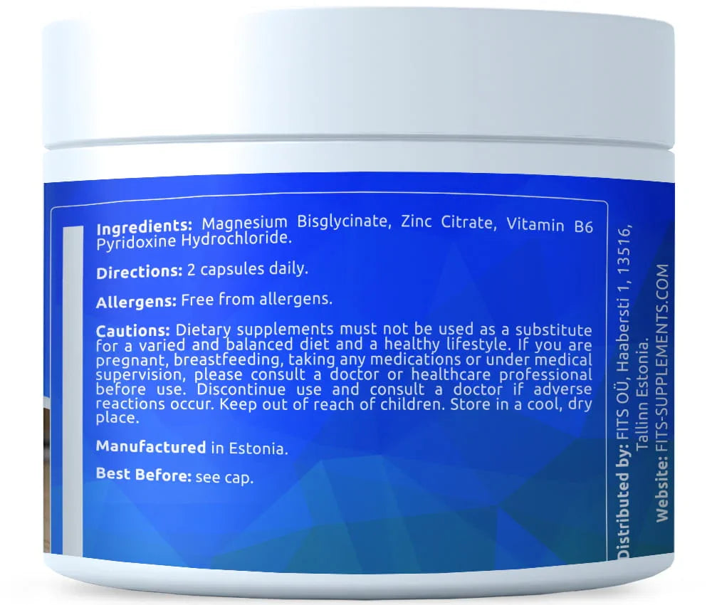 Složení: Bisglycinát hořčíku, citrát zinku, hydrochlorid pyridoxinu, kapsle z pullulanu.